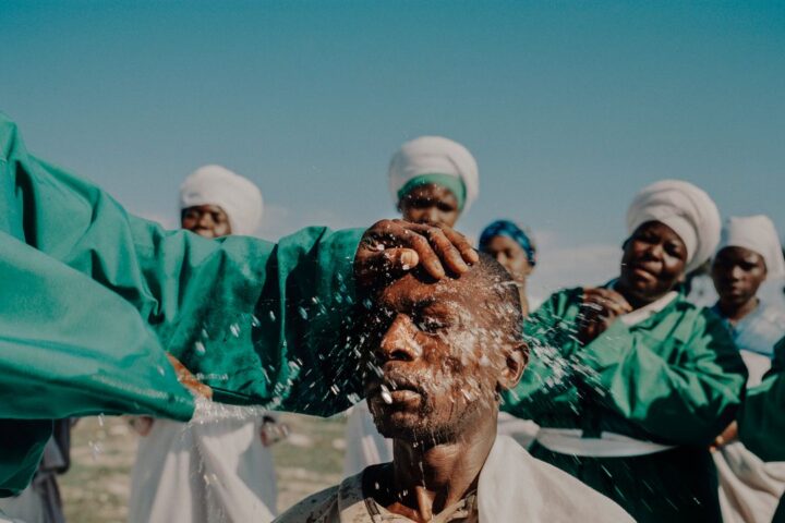Tory Burch’s black mirror-embellished tiered dress contrasts with the white walls of Masseria Apulia, its reflective surface sparkling in the sunlight. Turquoise sandals add vivid texture, while ivory satin teardrop pouches and elongated stone fish earrings create a decidedly coastal feel.