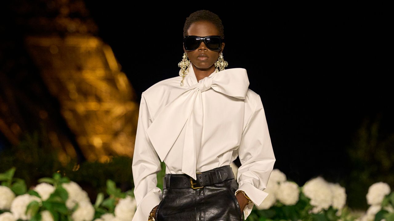 Tuck Another Tomorrow’s bow shirt into a crisp leather skirt to recreate Saint Laurent’s “decadent aristocratic” look; the dramatic knot is reminiscent of Anthony Vaccarello’s Fall 2023 menswear show, when he first experimented with exaggerated shirt bows. Statement earrings and pointy-toe heels are also essential.