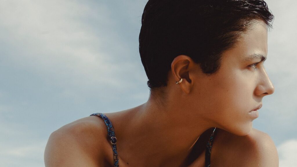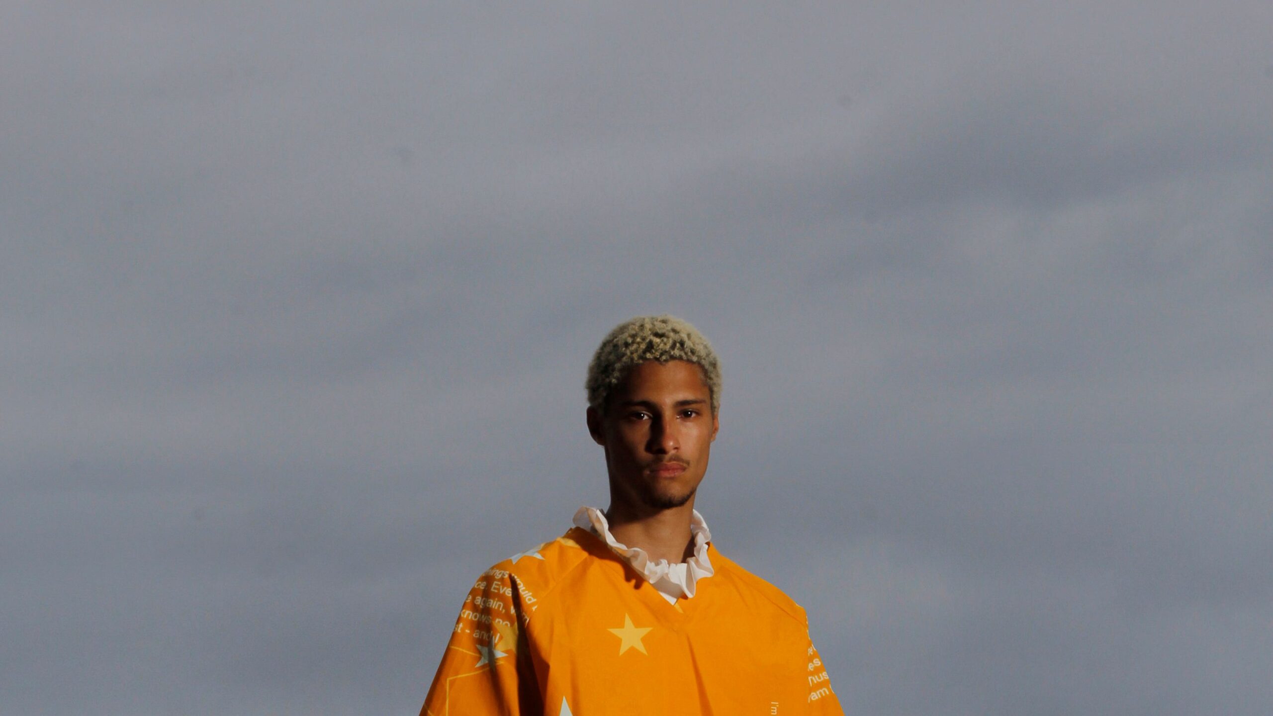 He leaned toward ambiguity, applying a teal-blue sans-serif expression to a gray V-neck sweater layered over a red ruffled collar and paired with surf-inspired printed shorts. It also appeared on T-shirts with clipart lettering, paired with bias-cut skirts in fluted silk chiffon and paired with hats fit for a romantic drifter. Casual shirts and vests were a through line from his early work in gradient stretch fabrics, but in bold sporty primaries. A business shirt and tie paired with oversized cotton shorts. Levy’s book contains ideas about existence in the Internet age and about real and projected identities. Higgins said he wanted to take tropes and make them all into one, so these different elements and dress codes clashed and mixed.