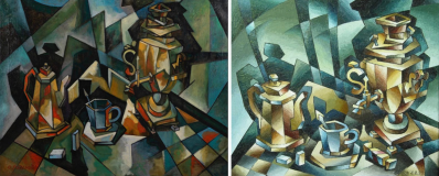 Left: Study in still life by Olga Rozanova (1915-17). Right: Andrei Saratov’s 1999 study in still life.