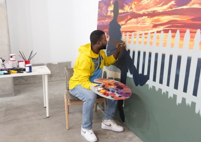 The resident model feeds directly into the FOG demonstration. Elangwe, a Cameroon-born painter who now lives in San Antonio, spent seven weeks in San Francisco photographing local residents and absorbing the city’s rhythms. The resulting paintings place his subjects within a recognizable Bay Area context, weaving the portraits in place with a steady hand and an eye for exaggerated color that still feels rooted in reality.