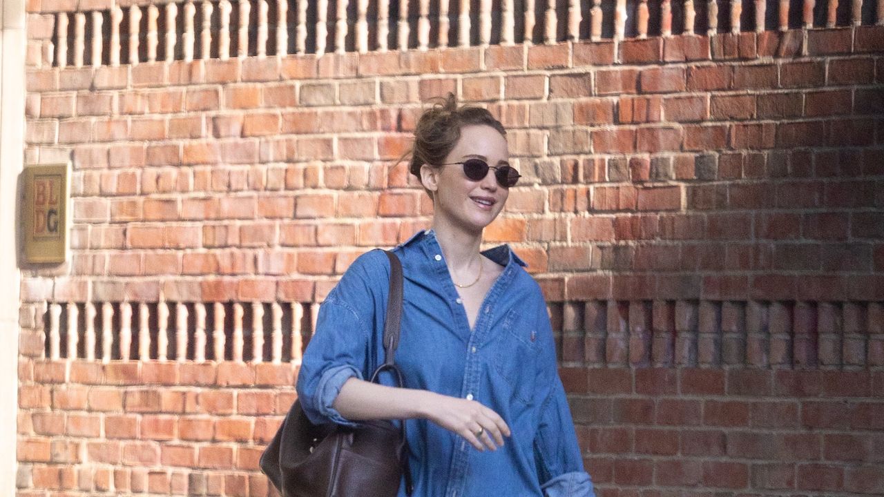 Last week, Jennifer Lawrence showed her true (primary) colors. Now, she’s trying out another time-honored trend: the Canadian tuxedo. For a morning walk with husband Cooke Maroney, Lawrence opted for a crisp denim look, pairing an oversized button-down top with baggy wide-leg jeans.