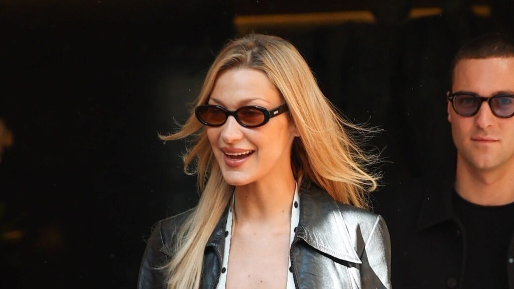 But, even by her standards, it is a person who emphasizes it. After walking the St. Laurent show under the glittering Eiffel Tower last night, Hadid attended a party wearing a black black nipple top, a large brown leather jacket, pointed toe kitten heels and a pair of black exhaust pedal pushers.
