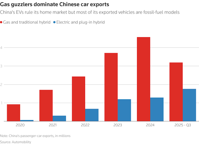 Fossil-fuel automobiles have actually made up 76% of Chinese automobile exports given that 2020, and complete yearly deliveries leapt from 1 million to likely greater than 6.5 million this year, according to information from China-based working as a consultant Automobility.