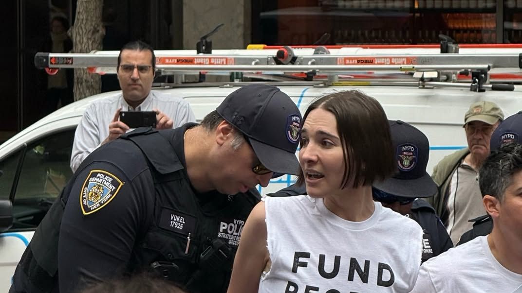 Nef and Manning were both members of a group of nearly 200 people (actor Hannah Einbinder and writer Molly Crabapple were also on hand) mobilized by a handful of organizations, including the Free Jewish Presbyterian Church of Palestine and Jewish Voice for Peace. Wearing T-shirts that read “Fund the People, Not the Bombs,” their message to New York lawmakers was to join other Democrats in opposing the sale of U.S. weapons to Israel. Measures targeting the issue, led by Vermont Sen. Bernie Sanders, have attracted growing Democratic support but have yet to win over Schumer or Gillibrand. “This is a protest to send a message to vote against Trump’s intention to send $450 million worth of bombs to Israel in the near future to support his continued war on Lebanon, war on Iran and genocide in Gaza,” Neff said. By the end of the afternoon, about half of the protesters had been arrested by the New York Police Department.