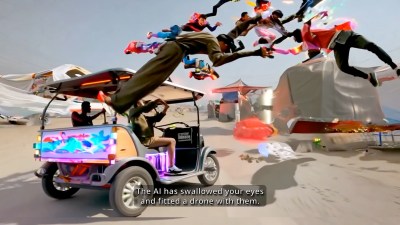 The video shows the unpaved streets of Domiz, and Steyerl’s subjects describe tagged objects in images and videos from around the world. They guessed where these places might be – such as Switzerland, China and the United States – and the AI images morphed to provide a facsimile of each location. They thought they’d been helping design autonomous drones and tuk-tuks (three-wheeled motorcycles), but they weren’t sure. This contradictory rhetoric contrasts with the serious consequences of artificial intelligence when Steyerl interviews an Iraqi journalist who was hit by a drone attack and two colleagues who tragically died. Steyerl, however, returns to the refugees’ hopes for artificial intelligence. As a man flies a toy drone surrounded by children, his voice echoes: “The future, the future, the future, it’s all the same – another world.”