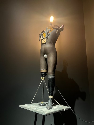 Below the “Ballet Mechanique” hall stands a sculpture created by John Heartfield and George Grosz in 1920 The vulgar hearts of the middle class have gone wild (mechanical Tatlin sculpture). The piece centers on a tailor’s dummy, representing a group of people who were, perhaps of their own volition, transformed from objects of war into instruments of commodity production. A revolver and military paraphernalia were thrust into the dummy’s chest, a pair of plaster dentures served as a fig leaf for the anomaly, one leg was replaced by a stick, and a shiny light bulb replaced the head, covering the entire hybrid. The work’s profusion of prosthetics reflects a nascent vision of hybrids – half human, half machine – no doubt inspired by the influx of amputees returning from the front lines.