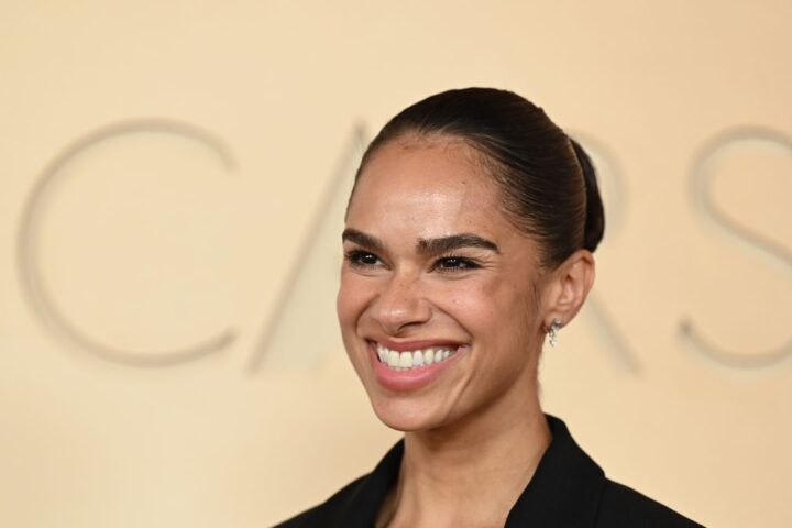 A black woman stands in front of a large painting.