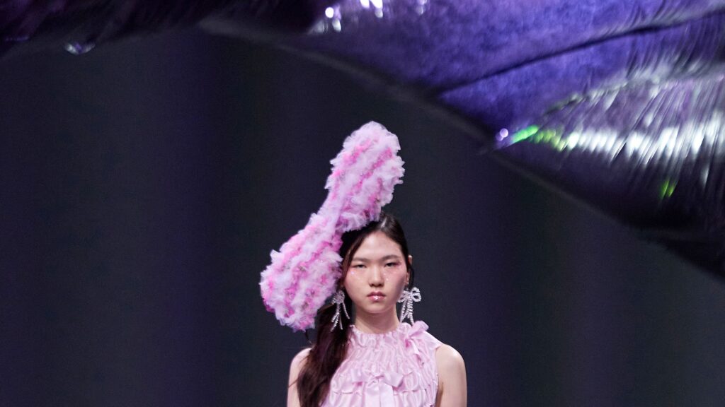 What it looks like: Traditional silhouettes reimagined with playful volumes (as if the wind between the spiers was picking up on the climb), as well as abstract symbols and decorative details designed for double consideration. Graduation-style capes and skimpy skirts are pleated, the epitome of British messy style. The funnel neck is reinforced with strips of leather, and the classic trench is made from light blue patent leather with loafer-like fringing on the lapels. Silk tank tops and soft knit dresses drop at the waist, while stretch-crepe suits are tailored for a slim fit. Multifunctional zippers and jeweled boutonnieres encourage individuality, although these rebellious vibes are punctuated by innocence and whimsy. A cute custom pink corduroy jacket was modeled after Kearns’ daughter’s school jacket.