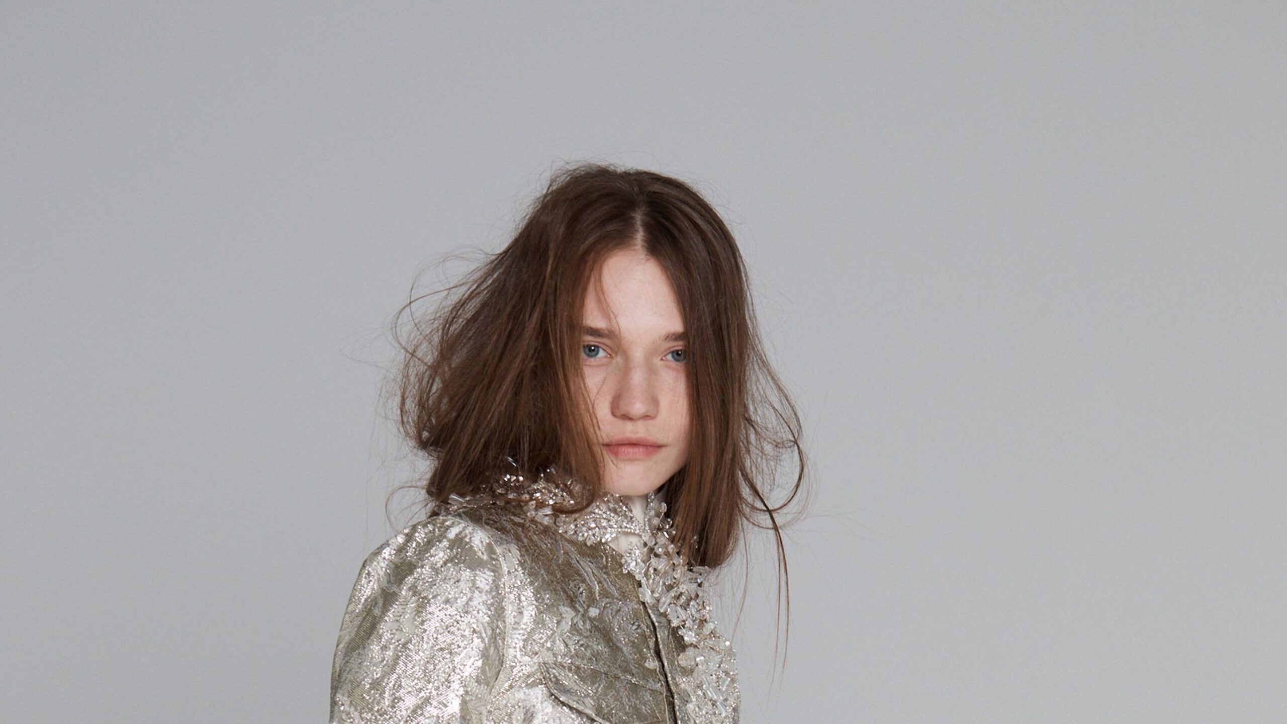 Traditional dictionaries have a driving force but also a heightened tempo due to manufacturing and craftsmanship. From a croc-effect two-piece to the generous use of brocaded Lurex, texture is at your fingertips. A raw, ruffled white denim jacket recalls their signature utilitarian silhouette. “When we first did it, people got hurt!” Max said with a laugh. While studying at Central Saint Martins, the design study of Galliano’s long gown paired with a vintage parka became an ethos for Marques and Almeida, who reveled in this duality. Satin checks and florals on bias-cut petticoats and slinky halternecks recall Kurt Cobain’s uniforms, while 1980s stock-market trader shirts feature baroque details. A bomber jacket comes in sky-blue crocodile; a soft marshmallow gown is paired with multi-pocketed khaki army pants. A sporty ribbed-knit vest is paired with a heavy Mikado skirt that sculpts the hips. “It can be one person’s wedding dress, and it can be another person’s wedding dress. Paired with a hoodie, it’s a trip to Tesco.”