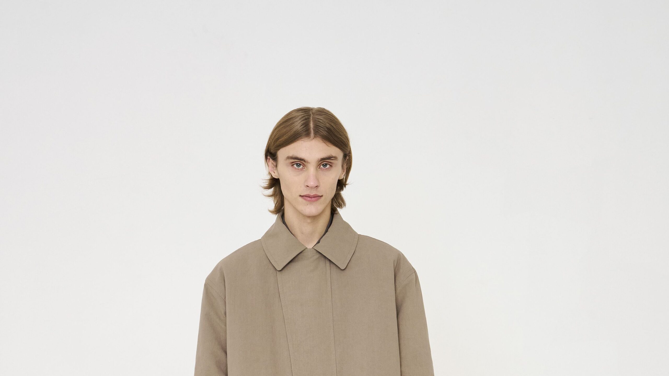 Agnes Martin’s work influenced the color palette and atmosphere. “Quiet authority is the main motto,” CEO Ladislav Zdút said on Zoom. Today, few people project confidence without bravado or loud noise. Soft and “feminine” touches in the collection—a neat jacket with scarf lapels, a draped scarf shirt, long, untied fabric belts on baggy trousers—only enhanced its luxurious ease.