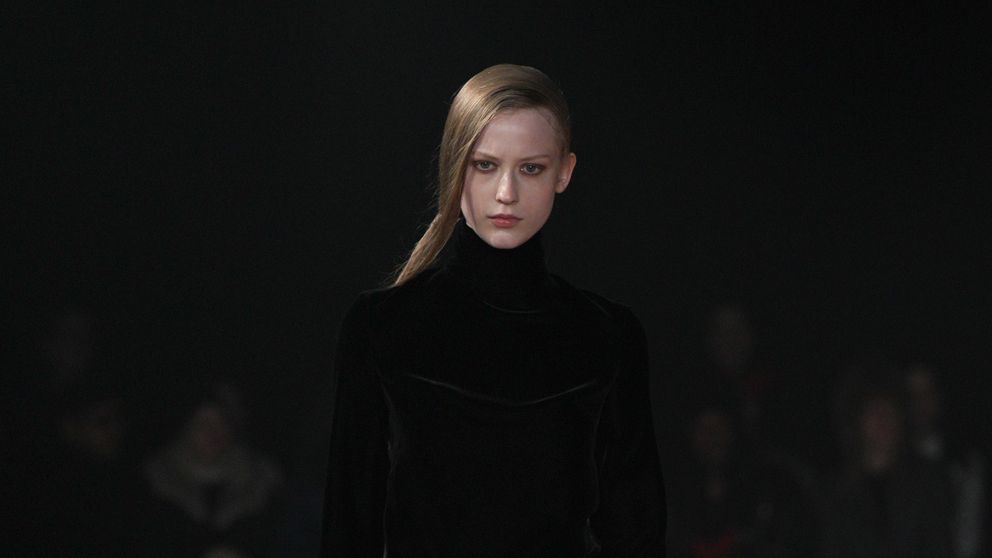 Gao also wanted to make the elegant drape of a bygone daywear era feel intuitive and effortless, so he designed gray and cream wool coats with built-in blanket scarves, as well as pants with asymmetrical overlays and simple little miniskirts that tied at the waist.