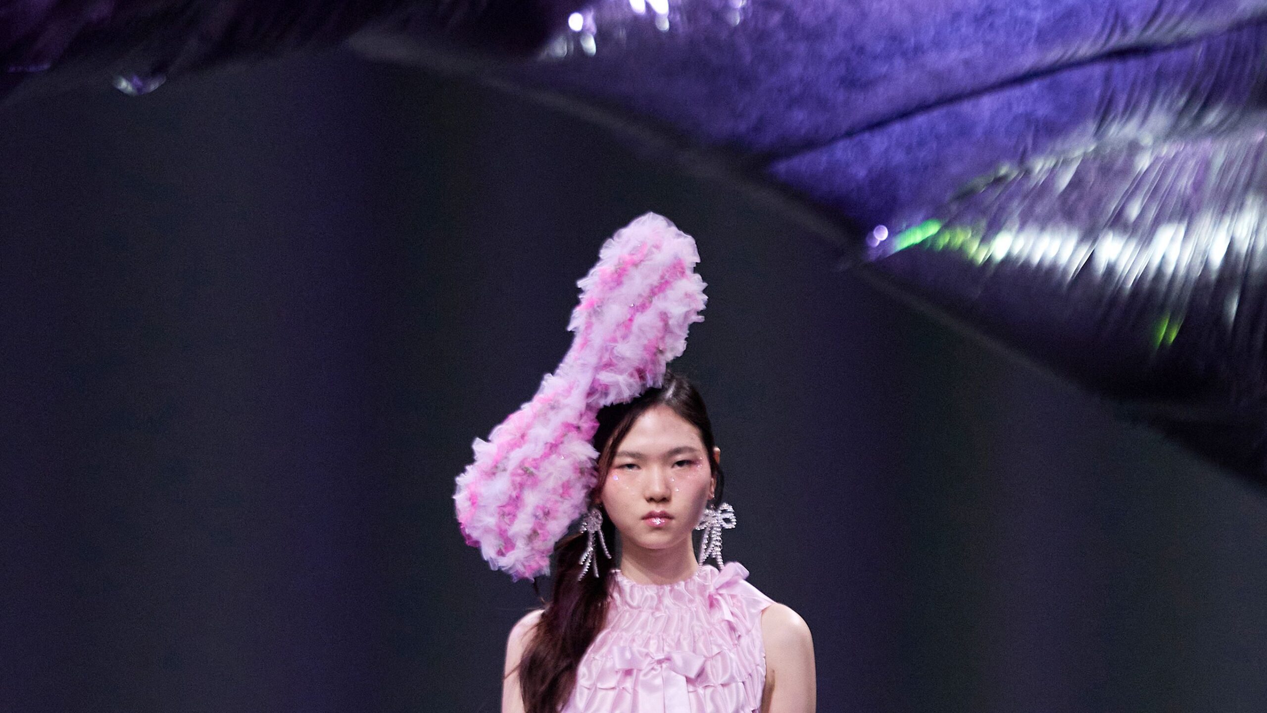 The most eye-catching bow sat giant on the head of a model wearing a dress made of resin butterflies connected by threads, designed to flutter around her body as she walked, which Fang said took more than a month to create. Combined with Fang’s 3D-printed ballet slippers, convex-soled jelly, and the commercial EDM breakdown played on the show, it reminded me of mid-Prom Vegas: kawaii sci-fi. This cleverly conceived collection offers plenty of possibilities for Fang’s followers to incorporate into their future wardrobes.