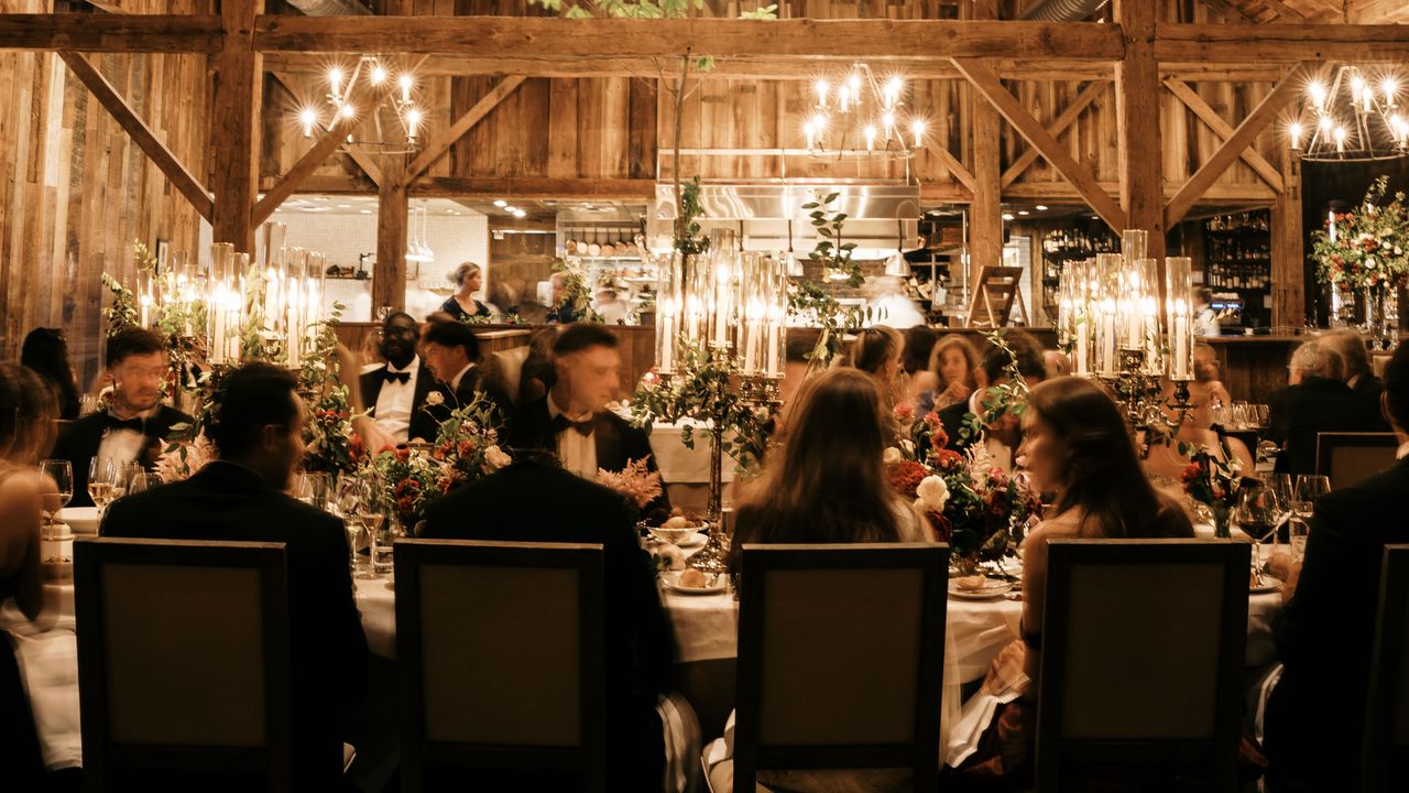 Another added benefit to this venue? “If you’re in a barn, half the heavy lifting in the design is already done by the building itself. A barn (unlike a tent) gives you a blank slate with built-in rigging points and toilets,” Easton points out. This allows you to easily hang design elements such as curtains that soften the ceiling and walls, eye-catching lighting, or floral fixtures that give the room a natural, organic feel. “Imagine a high vaulted ceiling paired with exposed wood beams, like an invitation for your favorite fabric color to sparkle across the ceiling. A few lines of tulle or silk can reframe the architecture, softening the space without overshadowing its character,” she adds. “Lower the ceiling further by placing chandeliers, ensuring they sit perfectly above the center table.”