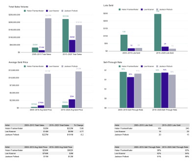 Adding Pollock to the picture further clarified the picture. Like Krasner, Pollock’s market was limited by the quantity of material. From 2005 to 2015, only 20 works were traded, with a total value of $226; over the next decade, only 15 works were traded, for a total price of $181 million. This means the average prices are $11 million and $12 million respectively. But even if Pollock’s prices remain stable and Krasner’s rise significantly, the value of her work remains lower. This gap illustrates a structural problem with how the market allocates value at the top.