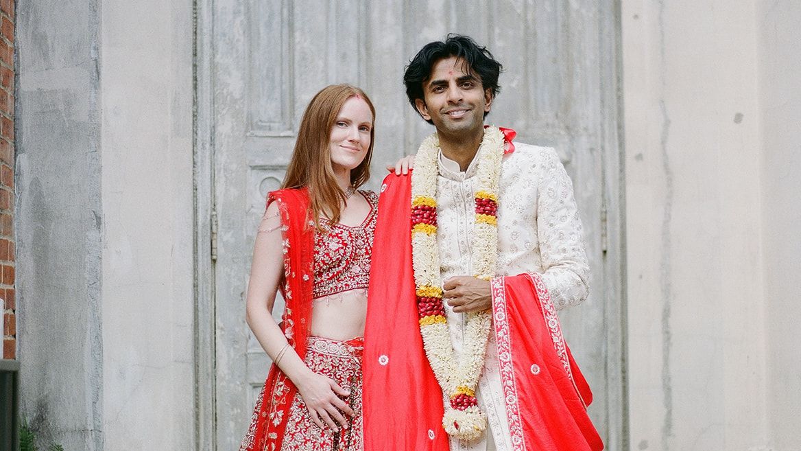 To celebrate their Hindu rituals, the couple went shopping together at Nazranaa, Maia chose a red lehenga decorated with flowers and crystals, and Neil chose a traditional sherwani with a red dupatta (scarf) to match Maia. For Saturday’s ceremony, Neal wore a custom-made suit by Craig Robinson of Brooklyn Robinson.