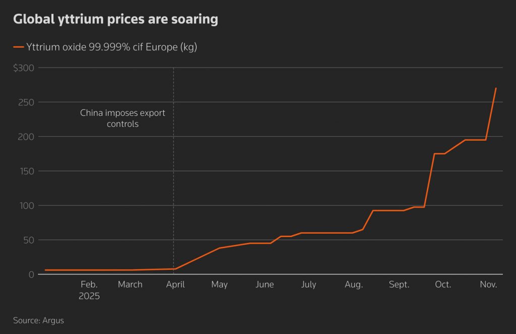 Argus information reveals that European costs for yttrium oxide, utilized to make thermal obstacle finishings, have actually climbed 4,400% because January to $270 per kg. Information reveals costs in China have actually climbed 16% over the duration, to concerning $7 per kg, however are still dropping.
